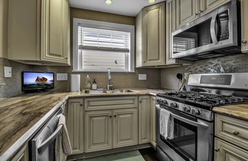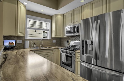 Fully updated, modern kitchen with tile backsplash, stainless steel appliances.