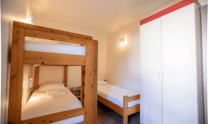 Accommodation: GeneralAreasTotal area (m2) : 40AnimalsAnimals: accepted under conditionswith supplementcompulsory vaccination bookletkept on a leashDog of 1st class prohibitedDog of 2nd category prohibitedRooms & BeddingsSeparate rooms: 3Separate roomsBed 2 persons : 1Dimensions: 140 x 190Separate roomsBed 1 person : 4Dimensions: 80 x 190Type of bedSuperimposedSeparate roomsBed 1 person : 2Dimensions: 80 x 190Child / BabyUmbrella bed : 2on requestBeddingBedding adapted to the number of personsSheets: suppliedPillows: providedCovers: providedKitchenKitchen : 1in staydishes/covers adapted to the number of personsKitchen equipmentSink: 1Refrigerator / Freezer : 1Vitroceramic plaques: 1Microwave : 1Health facilitiesBathroom(s) : 1BathtubWashbasinWC : 1separated from the bathroomInterior equipmentMultimedia equipmentTelevisionfreeExternal equipmentBalcony: 1