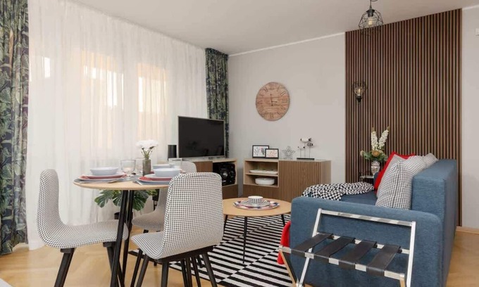 This fully equipped apartment can comfortably accommodate up to 4 people - an ideal choice for a family getaway or a group of friends. The highly functional 41.5 m² space consists of a living room with a kitchenette, a separate bedroom and a bathroom with a bathtub and toilet. There is also a small balcony with garden furniture, where you can enjoy a sip of aromatic morning coffee. The living area, equipped with a comfortable sofa bed and a TV with access to cable channels and a Smart TV function, is the perfect place to relax. The elegant bedroom offers a king-size bed and a desk with a chair, so guests working remotely will be able to take care of business duties in comfort. The apartment also features high-speed, free Wifi connection. A wide range of amenities and comprehensive furnishing of the apartment with necessary kitchen and bathroom accessories and equipment guarantees a comfortable stay. A complimentary set of toiletries (soap, shampoo and shower gel), towels and linens are provided to facilitate the start of each visit. The apartment also provides guests with a washing machine, which is sure to be appreciated by families with small children or those planning a longer stay. The interior has a modern design, which is warmed by wooden elements and parquet floors. Harmonious, beautiful design and attention to detail will satisfy even the most demanding guests.