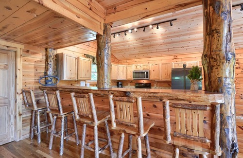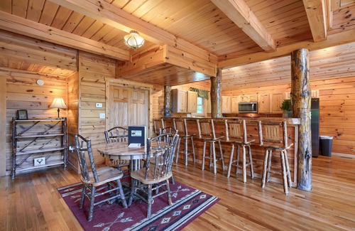 Seasonal in-ground pool, open Memorial Day- October 1st (weather permitting) This remodeled 5 br, 3.5 ba lodge is on 17.5 private acres with an onsite rock outcropping and hiking trail. This luxurious log home sits atop a hill with expansive views of the surrounding valleys and is just minutes from Rock House. The home has been recently updated with new flooring, updated decor, fresh bedding, new kitchen counters, and so much more! It offers luxury, privacy, and the perfect location for your next family vacation or long-awaited friends' trip! Must be 25 years or older to rent. AWD/4WD recommended.