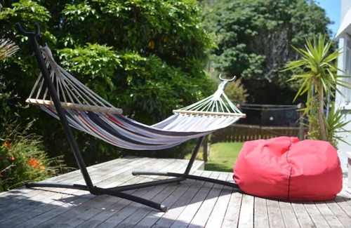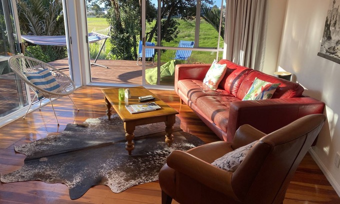 The sunny deck is surrounded by trees & overlooks Broadlands Reserve. Relax in the hammock or chat with friendly ducks waddling up from the creek. The Sunday Market & Waihi Beach Pub, with frequent live music, are a stone's throw away. Located down a very quiet private lane.