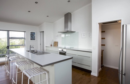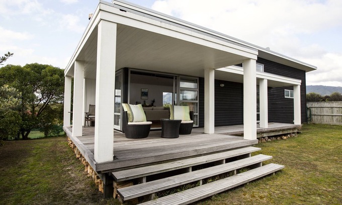This Waikanae holiday home includes upmarket open plan living in the main house... Unwind in comfort, or relax on the sheltered deck with the BBQ on hand for classic kiwi summers.