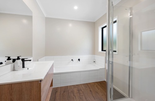 This modern and near-new three-bedroom, two-bathroom home sleeps up to 10 people in style. The two King sized beds can be split into King singles if needed, and the lounge includes a fold-out sofa bed for two.