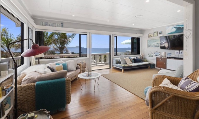 This four-bedroom home enjoys stunning expansive sea and island views over Bream Bay, with an easy walk down the walkway to the white sands and patrolled surf beach below.