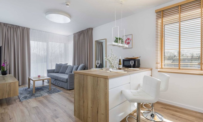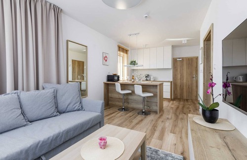 This apartment with a balcony is suitable for a stay of 4 people - an ideal choice for a getaway for a couple of friends or a family! The living space offers a spacious living room with a kitchenette, a bedroom and a bathroom with a shower. The apartment has a balcony, equipped with garden furniture, which allows you to enjoy your morning coffee in the company of a beautiful view or relax in the fresh air after a busy day. The fully equipped, tasteful interior is distinguished by its modern design and careful finishing. The apartment's color scheme and high-quality furnishings enhance the apartment's extraordinary atmosphere. Sublime and aesthetically pleasing decor and a wide range of amenities, as well as comprehensive furnishing of the apartment with the necessary accessories and equipment for kitchen, as well as bathroom, guarantees maximum comfort during your stay. To facilitate the start of each stay, a complimentary set of toiletries (soap, shampoo and shower gel), towels and linens are provided. The property is equipped with everything you need for rest and relaxation. There is also the possibility to stay with your favorite pet, as the apartment is pet-friendly (100 PLN/stay).