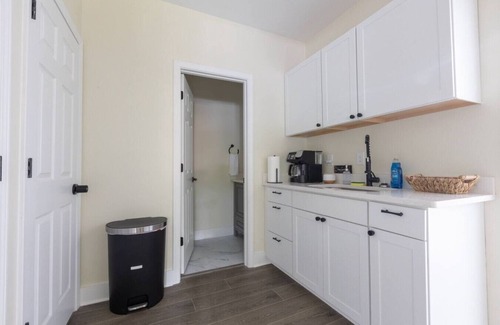 Central gathering area with two sofas, (Sleeps 2) dining table for 8, fully stocked kitchen with basic cookware, dishes, utensils, and a combination Keurig/drip coffee maker