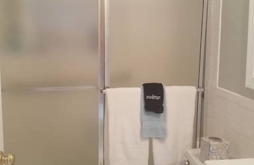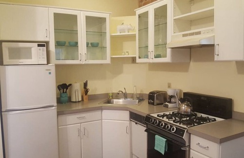 The kitchen has basic cooking necessities, (including a coffee maker, microwave, toaster, etc.) a dishwasher, and a 2 person dinette set. The apartment has a full bathroom with a bathtub and fresh towels.