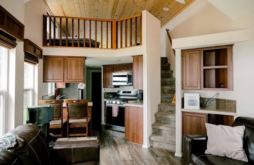 The Sea Eagle is a tiny home with a loft. The bottom level is about 600 s.f, and the loft is about 300 s.f. On the bottom level it's hardwood floors, leather furniture, very good quality cookware, knives, silverware and cooking utensils. The sheets are a very soft 800 thread count Egyptian cotton. The towels are large, plush and soft. The shampoo, conditioner and body wash are spa quality. Toilet paper is Charmin.