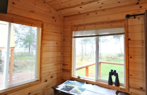 Bald Eagle is a 900 s.f. tiny home. 1 bedroom, 1.5 bathrooms, 1 full-size futon. Full Kitchen, 52" smart TV, 4-place dining table, queen bed. Outside it has a large deck with a charcoal BBQ, a large lawn that goes right to a 1/4 mile long sandy beach. For more details see the Bald Eagle listing.