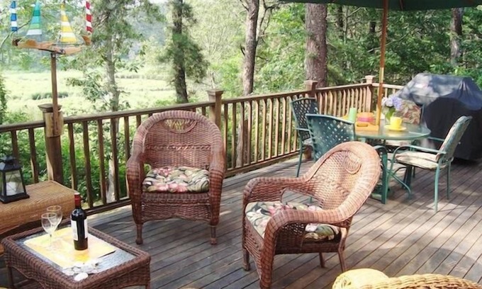 This spacious 4 bedroom, 3 bath Chatham Rental will surely delight you in every way. Just a short walk to the warm waters and gentle waves of Ridgevale beach – this home is perfectly nestled at the end of Soundview Avenue where the sights and sounds of the many birds will delight you. Watch from the spacious deck to see the heron, egrets and ducks coming and going through the inlet. The deck has easy access from the kitchen offering a gas barbecue grill – plenty of outdoor seating and 2 Umbrellas for shade.
