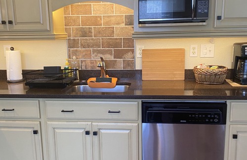 * KITCHEN: Fridge with icemaker and ice/water in door, gas stove, dishwasher, microwave, blender, combo drip/Keurig coffee maker,14-cup drip coffee maker, toaster, and tons of dishes, pots/pans and utensils. Granite countertops.