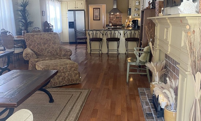 LIVING ROOM and DINING ROOM: Great open floor plan with living room/dining room and kitchen. The living room has a large Flexsteel leather sofa and extra seating centered by the decor fireplace below the 60" smart TV. The glass top dining table by the kitchen seats six, and the granite kitchen island seats four. Bookcase by the fireplace has games and books. All hardwood flooring.