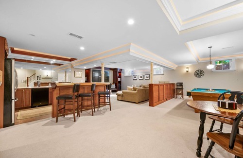 When you are ready for the entertainment to begin, head to the lower level where you will find a full wet bar with a keg tap, sink, dishwasher, full refrigerator and seating for eight, a pool table and media seating area featuring a new 96" HDTV. The large living area also includes a small table for cards and puzzle making. The lower level also includes a newly renovated multi-purpose room which includes light weights, exercise bands, yoga mats and an HDTV perfect for a workout. The room is quite large (14 x 18) and can be used for rainy day activities or quiet space to escape. There is also a 5th full bath with shower on the lower level.