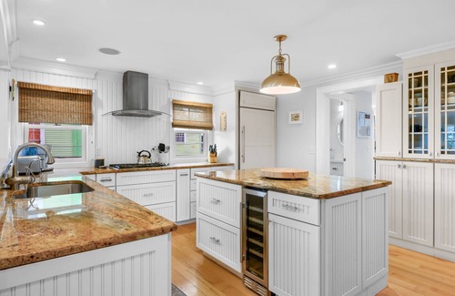 An open dining/kitchen area with a large dining table along with a breakfast bar is great for large family dinners or easy entertaining. The kitchen is complete with Subzero refrigerator. a wine fridge and Wolf appliances as well as all the small appliances you need to complete your stay including a Keurig and KitchenAid mixer. The kitchen is fully stocked with everything you need to prepare meals. Make sure to take in the views of the Atlantic Ocean just across the street while you dine. For your convenience, just off the kitchen is a large mudroom, half bath, laundry and side entry perfect for entering after a day on the beach.