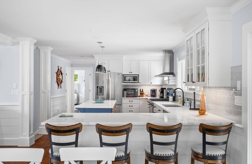 This luxury rental offers an open floor plan, light and spacious, central air and includes free WiFi! From the Mahogany deck you will enter a large chef's kitchen with a center island. Stainless steel appliances, white cabinets and granite countertops create a modern feel to this open kitchen - perfect for preparing family meals and still be able to be part of the action! Three chairs at the breakfast bar add more seating and encourages the kids to hang out while the grown ups are cooking!