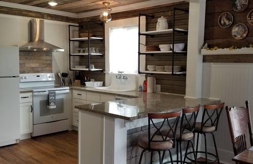 * KITCHEN: Fridge with icemaker, glass top electric stove, dishwasher, microwave, blender, combo drip/Keurig coffee maker,14-cup drip coffee maker, toaster, and tons of dishes, pots/pans and utensils. New cabinets and granite countertops. Dining table seats four, adjacent bar seats 4.