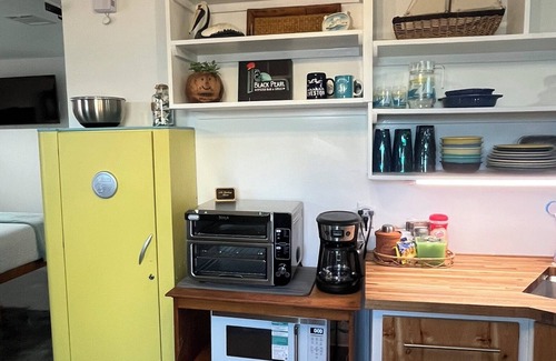 You will enjoy close proximaty to the beach, private fenced in yard w/BBQ grill and patio table. The kitchenette, has a small fridge, small counter top oven, microwave, toaster and coffee pot. There is a small compact dining table. Additional table outside.