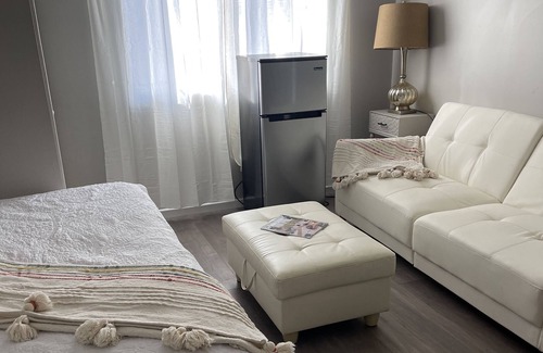 This is a private entrance 2 room Suite attached to the main house. the accommodations include a sitting area with a queen aerobed, couch and arm chair, tv and coffee setup with a mini fridge and microwave. Guests will have access to the outdoor barbecue and inground pool. We are walking distance to town and all houses of worship. The North Fork Wine Country is a 20 minute drive or uber away. Massage and house chef are available for an additional charge and reservations. Charcuterie boards are available. Please inquire for your stay.