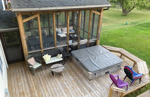Enjoy 4 bedrooms, 3.5 baths, huge screened porch, back deck with 6-person hot tub, indoor fireplace and outdoor fire pit, pool table...all on 25 public acres of meadow and woods -- with a well-traveled shortcut to the game.