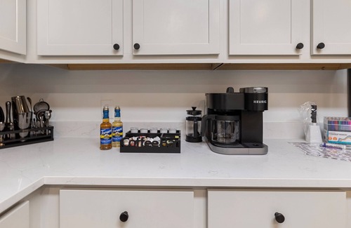 • Coffee bar w/ Keurig & drip coffee + flavored syrups & toppings
