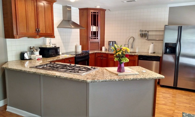Walk to restaurants and downtown shopping. Close to I-85f. Freshly-decorated 600 SF self-catered guest house with safe, off-street parking within walking distance of our charming downtown. King bed, fresh linens and seasonal bed coverings, fluffy towels and bathing amenities, fully stocked kitchen with granite and stainless steel, large bath with jetted tub and Restoration Hardware shower. Fully furnished with plenty of storage, Roku Smart TV, free 300 mbps Wi-Fi, and use of shared pool.