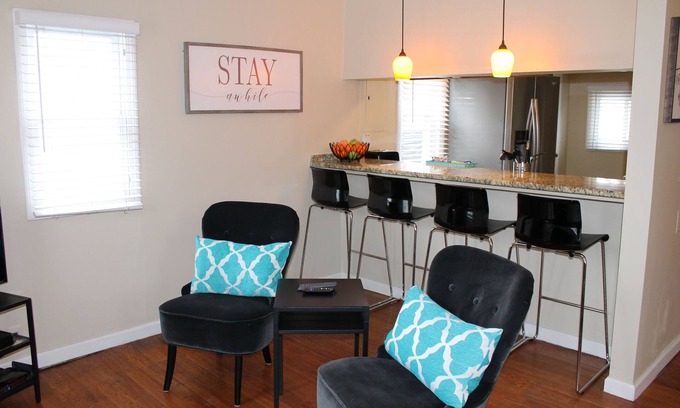 The living space has a large sofa, flat screen TV (Youtube Live TV , Netflix, and WiFi included), and counter top area with bar stools.