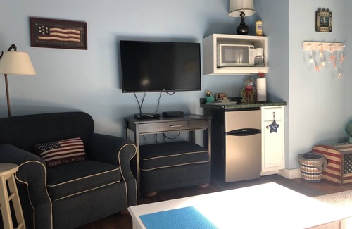 Nestled in the trees atop Main Street, this unique cottage offers privacy while being centrally located. You can walk to the beach in seven minutes and avoid the traffic and expense of paying to park. Float in the Ogunquit River as the tide brings you down to Main Beach and back again. Convienently located on the trolley line to Ogunquit Village and Perkins Cove. Walk to nearby restaurants, bars, and shops. Rent water sports equipment nearby. The cottage features beautiful stain glass windows. Each bedroom has a private bathroom, private entrance with furnished outside deck, AC, sleepsofa, couch or two easy chairs, table and chairs, cable and a smart TV. A galley kitchen with dishwasher, microwave, gas stove and attached laundry room is sure to please. A large screened in room offers dining area and sectional seating area. Stare at the abundant stars you'll see at night as you gather round the fire pit and talk of the adventurous times. Great Fall Foliage rates available, inquire now for weekend or weekly rates