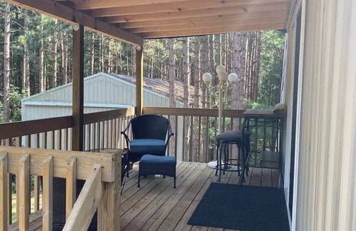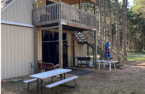 This space is unique, getaway walk to Lake Michigan while having secluded cozy place in the woods to enjoy with family. Upstairs sleeping and living while having downstairs of barn to entertain. Barn area has 2 picnic tables mini fridge 1 large bar . Under the porch swing, grill, bonfire pit large open area for volley ball or Frisbee.