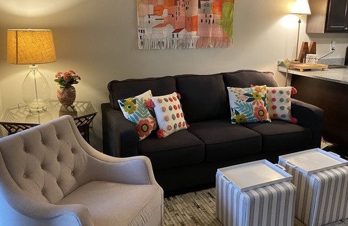 Sports fans will love this luxurious condominium located less than a mile from Davis Wade Stadium, Cotton District and downtown. The perfect place to re-charge, this two bedroom/two bath condo accommodates six guests. Each bedroom has a Queen bed & 42" smart tv. The den features a Queen sleeper sofa & 55" smart tv. Enjoy a fully equipped kitchen, washer and dryer, covered patio and pool! This condo even comes with 2 reserved parking spots. Everything is BRAND NEW!