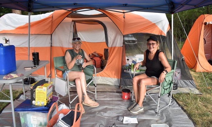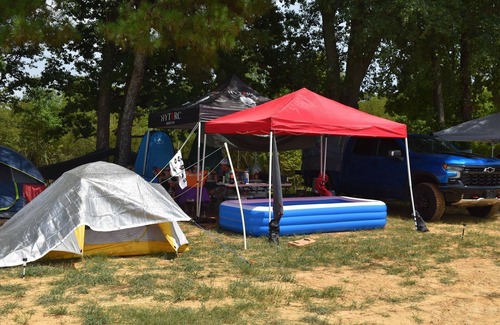 Tent Camping for Rock The South. 1/2 mile walk to the entrance. A real bathhouse for tent campers only wristbands must be worn. 4 people 1 tent, one pop up tent and one vehicle. Gas grills only. 2.1 miles to Wal-mart for supplies. Cheap food truck and awesome Karaoke on Wednesday night so practice up.