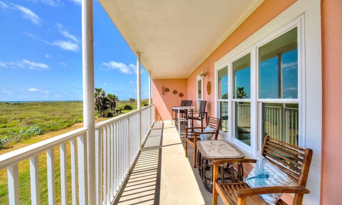 Check into relaxation in this totally remodeled second-floor condo which sleeps six. Rattan furniture and comfy cushions in the living room keep you comfortable while watching the flat-screen TV or looking out to the Gulf of Mexico. The cozy kitchen has all the appliances, utensils, and dishes you need to enjoy your stay. Stainless steel appliances to modernize your cooking needs. Lining the kitchen is the bar area for dining. You can go out the door to step onto the private balcony which overlooks the yard and has Gulf views. See it all from chairs on the balcony, whether you want to watch a game of sand volleyball or see the seabirds diving in the waves. The rolling dunes are peaceful. Back inside, the master bedroom (BR1) has two queen-sized beds and an attached upgraded bathroom. The décor abounds with beaches and shells. Tropical ceiling fans keep you cool throughout the day and night in all the rooms. The second bedroom (BR2) has one queen-sized bed. All the bedding matches with quaint coastal designs. The second bathroom has an upgraded sink and shower. Amenities include: TV, Wi-Fi, access to Charcoal BBQ pits and picnic areas, laundry facilities, 2 Boardwalks to the Beach, 2 Shared Community Pools. Located near downtown Port Aransas, you have easy access to the golf course, shopping, restaurants and entertainment.
