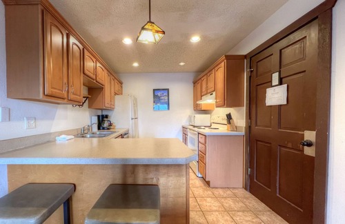 This 2 bedroom / 2 full bath fully equipped condominium offers very generous square footage for families and groups that need to spread out. There is a fully equipped kitchen with a breakfast bar for 2 and comfortable seating for 6 at the dining room table. The master bedroom has a king bed with a private bathroom. Flat-screen TV is also in the master. The guest bedrooms are equipped with two twin beds. This one-level condo is easily accessed from the front of the building and is located on the second floor. There is onsite permitted parking available for 2 vehicles.