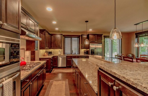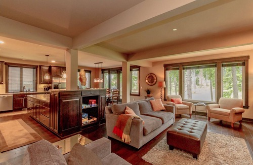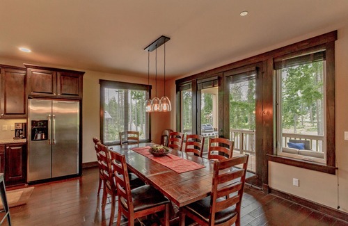 As soon as you walk through the front door, this lovely residence invites you to kick off your boots, shake off your coat and make yourself comfortable. You’ll feel right at home amongst the gorgeous interior, where wide planked, hand-scraped hardwood floors, a stone gas fireplace and well thought-out decor add warmth and beauty to your surroundings. Begin leisurely vacation days by sipping your morning coffee out on the private deck, and end them soaking in the private hot tub gazing out at expansive golf course views and lush trees towering overhead.