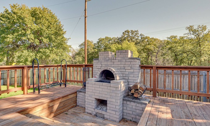 Get ready for a getaway filled with exciting lake days at this 3-bedroom, 2-bath vacation rental in Azle! Nestled in a quiet neighborhood, this home offers the perfect lakeside retreat with its full kitchen, inviting living area, and spacious backyard. Take the kayaks for a spin, enjoy a scenic stroll through Shady Grove Park, or simply unwind on the deck. As the sun sets, light up the outdoor fireplace, whip up dinner in the wood-burning pizza oven, and enjoy a peaceful evening with loved ones!