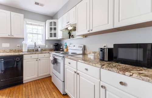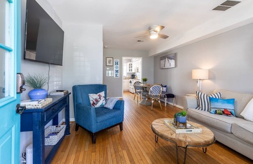 Start your day with coffee on the sunny front porch, then step into the cozy living room with a large flatscreen TV and Queen sleeper sofa. The open layout leads to a stylish dining area and a fully-stocked gourmet kitchen. Step out back to your private fenced patio and deck, complete with firepit, propane grill, and café seating for 4.
