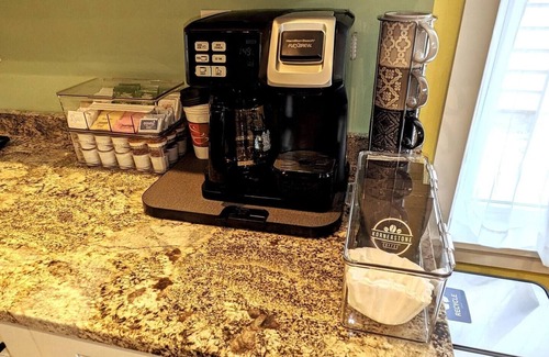 Start your day with local coffee or K-cups, or enjoy a kettle and tea on the bistro table on the private lawn under a shade umbrella.