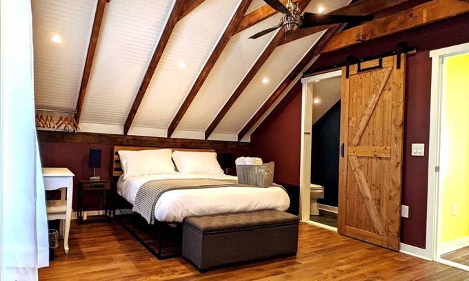 Upon arrival, enjoy seamless self-check-in with key-code door locks at well-lit private entrances. Inside, exposed rafter and beam cathedral ceilings provide a touch of old-world charm, harmonized by contemporary ceiling fans and cable railings. The open-concept living room and kitchen feature slate tile floors, granite countertops, stainless steel appliances, a farmhouse apron sink, and a breakfast bar crafted from reclaimed wood from the original roof.