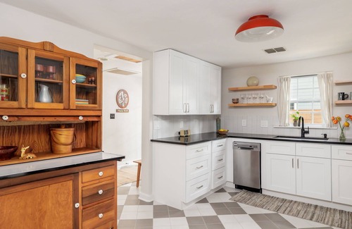As you enter through the gate in to the lovely front yard, you will find an inviting porch with two wooden rocking chairs to sit and enjoy a glass of wine in the evening or your morning coffee. Enter through the front door into the open living and dining area with ample space to gather for dinner or enjoy a movie night on the Smart TV located in the living room. Utilize the newly renovated and thoughtfully curated kitchen to whip up a meal for the group. The kitchen is fully equipped and features stainless steel appliances, ample counter space and natural light from the outdoors!