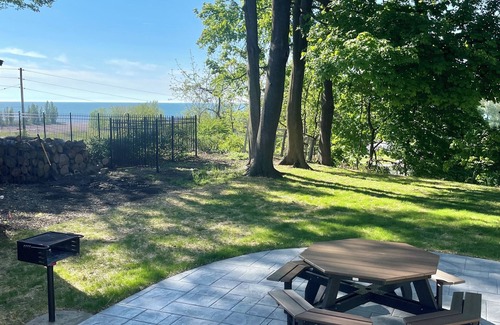 Outside you will find a newly installed stamped concrete patio great for gathering with your whole group and a fire pit for relaxing in the evening! Enjoy a beautiful view of the lake and Walnut Beach right from the patio!!