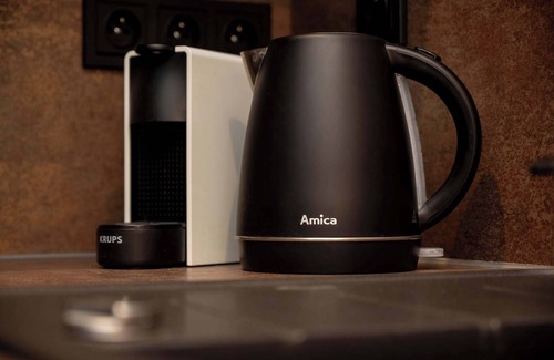 Induction hob, microwave oven, dishwasher, coffee maker (capsule), fridge, freezer, electric kettle, set of dishes, kitchen utensils, dining table