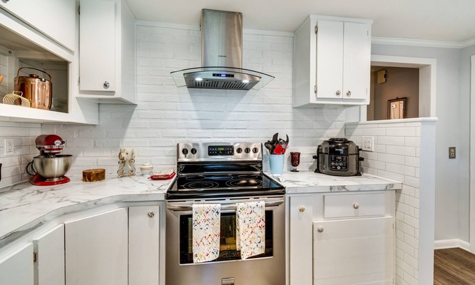 KITCHEN: Refrigerator, coffee maker, electric tea kettle, stove/oven, microwave, air fryer, dishwasher, toaster, blender, kitchen island, dishware & flatware, cooking basics