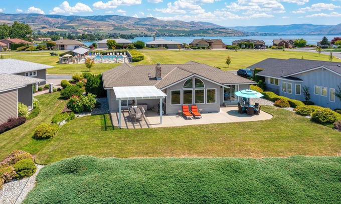 Wapato Point Resort lake view community waterfront single level 3 bedroom 2.5 bath home, internet access, wrap-around patio, and plenty of flat lawn areas for the children to play. Enjoy the lake and mountain views from most any room. The home is located next to the outdoor pool and less than 2 blocks to community sandy beach waterfront amenities and on-site watercraft rentals.