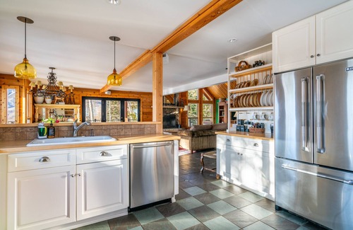 The vaulted living room offers floor-to-ceiling windows, plenty of seating for entertaining or relaxing, a wood-burning fireplace (not available for guests), and a flatscreen TV. Within the entertainment counsel, you'll find a large selection of games, puzzles, and local hiking, fishing, and fauna books available for guest use.