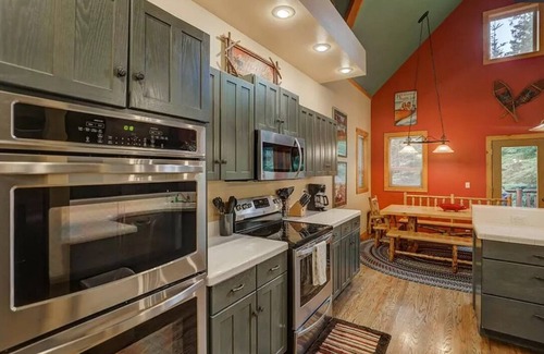 This cabin is great for gathering family and friends with plenty of space to spread out. Bring the family together in the large open family room and relax next to the cozy fireplace or socialize from the spacious/fully equipped kitchen while you showcase your culinary talents. With three ovens it’s a perfect space to prepare a large family dinner.