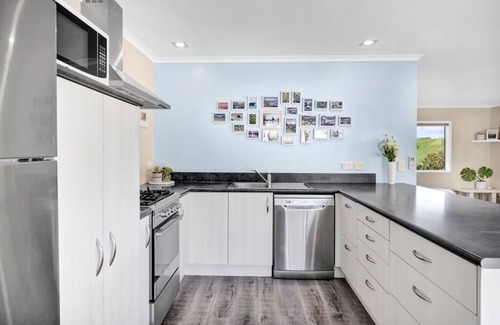 It is a tidy neighbourhood at the end of a quiet cul de sac with a rural outlook with sheep and cows in the view from the garden. It's less than a minutes drive to the closest surf break, with loads of other awesome surf options close by, plus the mountain hikes, bike trails and coastal walks. There is a large countdown supermarket only 5 minutes walk away. The town along with cafes and the famous walkway are also not too far. Around 5 minutes by car, or to walk to the center would take around 45 minutes.