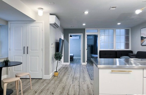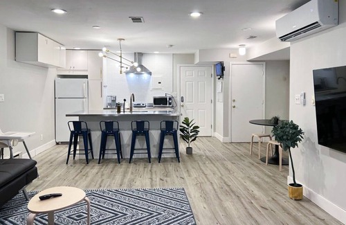 This apartment offers a spacious open-plan design, showcasing an expansive layout, contemporary decor, heightened ceilings, and ample natural light. Unwind in the family room with cinematic entertainment and craft delightful family meals within the kitchen. Situated on a tranquil one-way street in convenient reach of EWR & NYC, it's an ideal home for visitors. Please note the noise monitor in the dining area and outdoor cameras overseeing the driveway and side hallway.