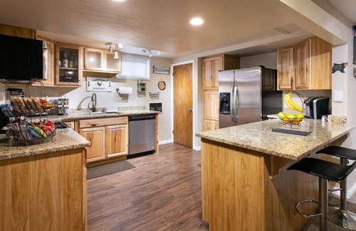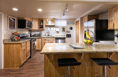Includes a queen bed, dual recliner couch, Smart TV, a fireplace, and Wifi. The kitchen is fully stocked with cooking tools, pots & pans, and dishes. A washer and dryer are also available.