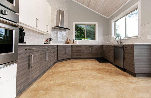 Gourmet Kitchen: Cook up a feast in the fully equipped kitchen featuring top-of-the-line appliances, including a stove, fridge, microwave, and dishwasher. The kitchen is stocked with cookware, utensils, and pantry basics.