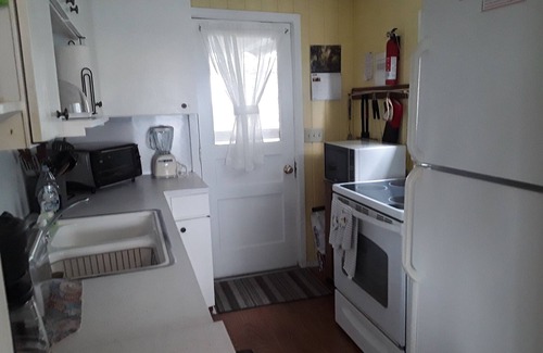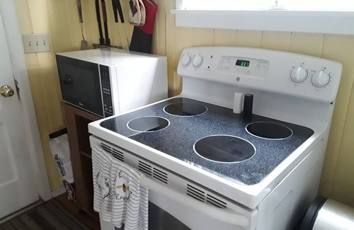 The cottage is bright, comfortable, fully furnished with a fully equipped kitchen and dining area down to the matching set of dishes, with newer appliances including a coffee pot, toaster, microwave and a flat top range plus full size fridge plus dishes, cookware and dinnerware..