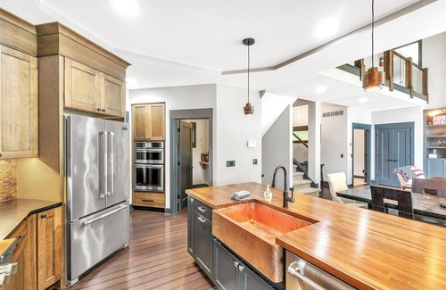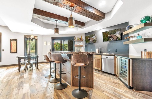One queen bedroom with lake view, plus a huge bunk room with two bunk beds and movie area for kids, plus an additional bedroom with a full size bed - total of 5 bedrooms. Walk in, soak in the view and relax. Gourmet chef's kitchen. Laundry. Movie area for kids in custom Bunk room.